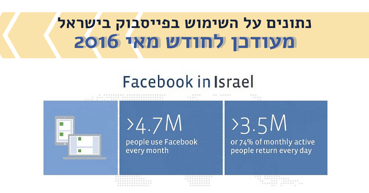ברבעון הראשון של שנת 2016 הגיע מספר המשתמשים בישראל ל-4.7 מיליון משתמשים בחודש ו-3.5 משתמשים ביום, מהם 4.2 מיליון משתמשים חודשיים מגיעים לפייסבוק דרך המובייל ו-3.3 מיליון משתמשים יומיים.