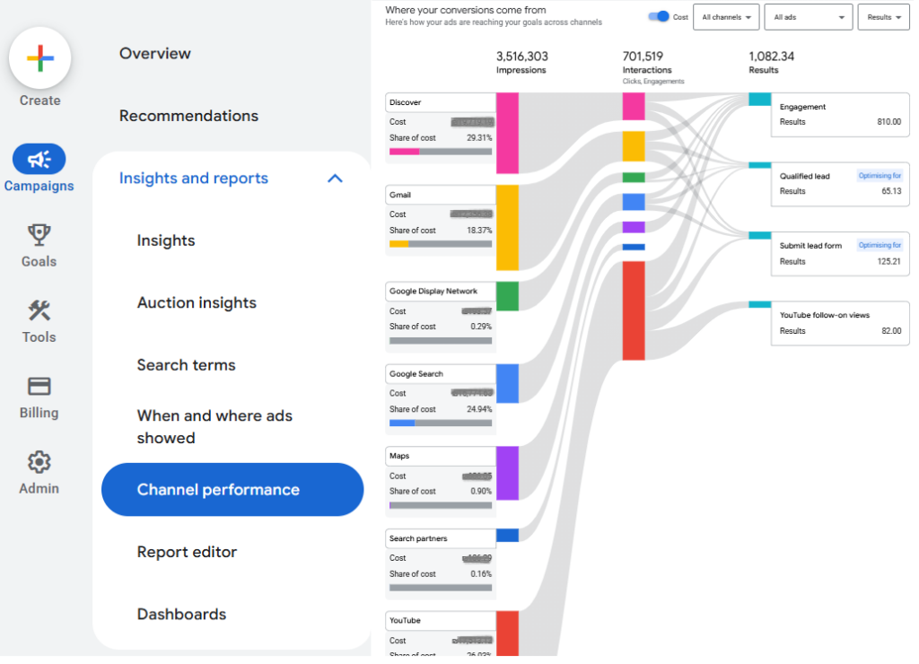 * Channel Performance – כלי חדש של גוגל תחת Insights & Reports, שמספק פילוח ברור של הקמפיין בין כלל ערוצי הפרסום. בעזרתו תוכלו לראות כיצד התקציב מחולק, אילו ערוצים מניבים המרות ואילו לא מייצרים אינטראקציה משמעותית.
