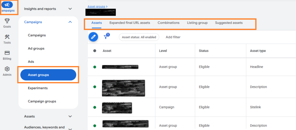 * דוחות נכסים – בחינה של ביצועי ה-asset group יכולים לשקף אילו מסרים ותמונות עובדות טוב ואילו פחות. אילו קומבינציות של מסרים גוגל מייצר ומה ביצועי עמודי הנחיתה.