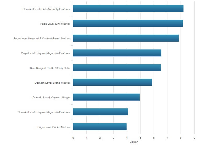 כמות, איכות וסמכות הקישורים ברמת הדומיין וברמת הדף הם הגורמים החשובים ביותר, ואחריהם הרלוונטיות של התוכן ושימוש נכון במילות מפתח.