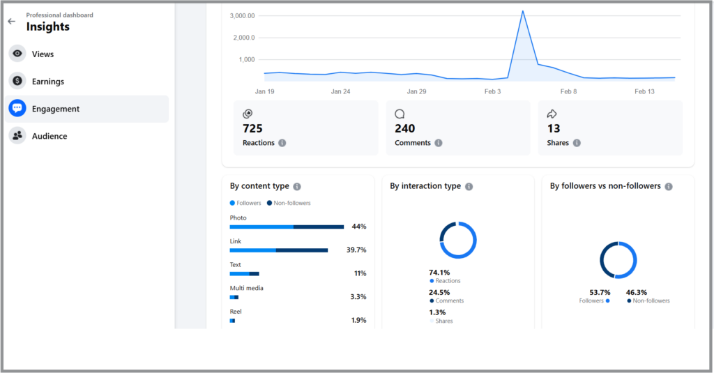מעבר לאנליטיקס, תוכלו לקבל מידע חשוב גם מפלטפורמת META תחת Insights של פייסבוק/אינסטגרם. זה יאפשר לכם למדוד מעורבות וחשיפה לעמודי הסושיאל שלכם, כמות עוקבים ומגמת מעורבות לאורך החודשים. תוכלו להבין אילו ימים בשבוע מניבים מעורבות גבוה, איזה סוג תוכן, פורמט מודעה ועוד מידע קריטי לפעילות סושיאל שלכם.