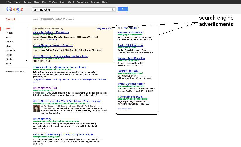 Search engine advertising usually includes text ads displayed above, besides or below the organic search results. Most ads are sold using the PPC payment method, in which the advertiser is paid only on clicked ads.